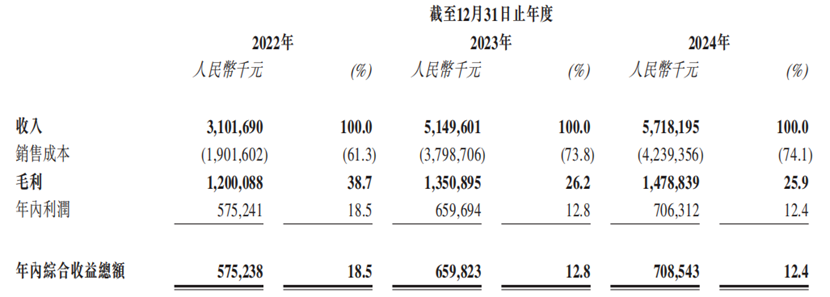 财务方面,周六福实现了高速的收入增长。2022年公司总收入为31.02亿元,2023年跃升至51.50亿元,2024年进一步增长至57.18亿元,复合年增长率达35.8%。收入增长主要得益于加盟门店数量的扩张、线上销售的爆发式增长以及黄金珠宝产品的市场需求提升。2024年,公司加盟模式收入28.90亿元,线上销售22.88亿元,自营店收入4.57亿元,三大渠道共同推动营收规模再上新台阶。