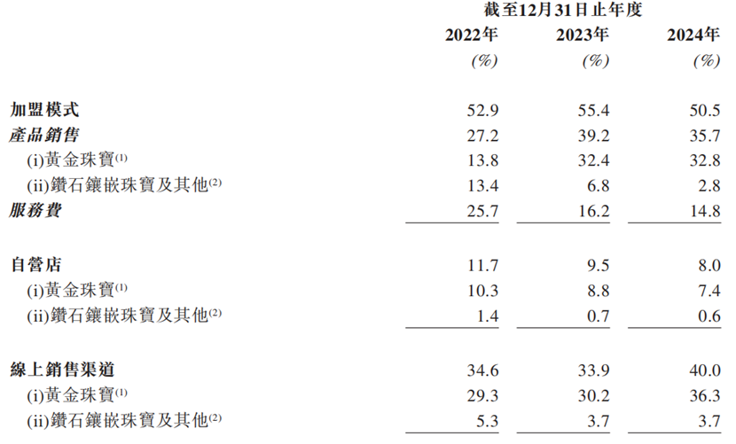 而从产品结构来看,黄金珠宝产品是公司的主要收入来源。2024年,黄金珠宝在加盟模式产品销售中占比32.8%,在自营店产品销售中占比7.4%,在线上销售中占比36.3%,合计贡献了公司营收的主要部分。钻石镶嵌珠宝及其他产品收入占比则相对较低,2024年在加盟、自营及线上渠道中分别占2.8%、0.6%及3.7%,反映出公司业务结构中黄金珠宝的绝对主导地位。